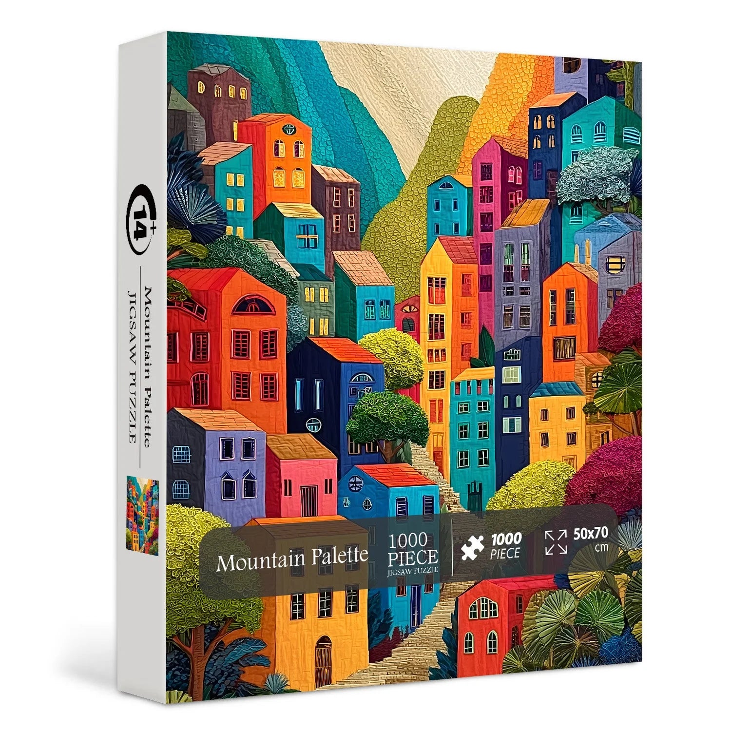 Lebhaftes Stadtbild auf einem Hügel: Das Bild zeigt eine farbenfrohe, dicht besiedelte Stadt auf einem Hügel mit Gebäuden in kräftigen Farbtönen (Rot, Orange, Blau, Rosa, Lila), die eine lebendige, skurrile Farbpalette ergeben.