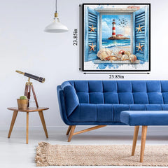 Ozeanfenster - In der Mitte des Bildes öffnet sich ein blaues Holzfenster langsam, sein Rahmen, der mit zarten Seestern dekoriert ist. Vor dem Fenster steht ein rot -weißer Leuchtturm auf einem felsigen Aufschluss, der nicht nur als Leitfaden für die Seeleute dient, sondern auch die Seele dieses Gemäldes ist. Rund um den Leuchtturm schwebt eine Möwenherde in der Luft, ihre Flügel schimmert unter dem Sonnenlicht und verleihen dem Bild ein wenig Lebhaftigkeit und Vitalität. Dieses Gemälde ist nicht nur ein wunderschöner Seelandcape, sondern auch ein Fenster in die Ozeanwelt!
