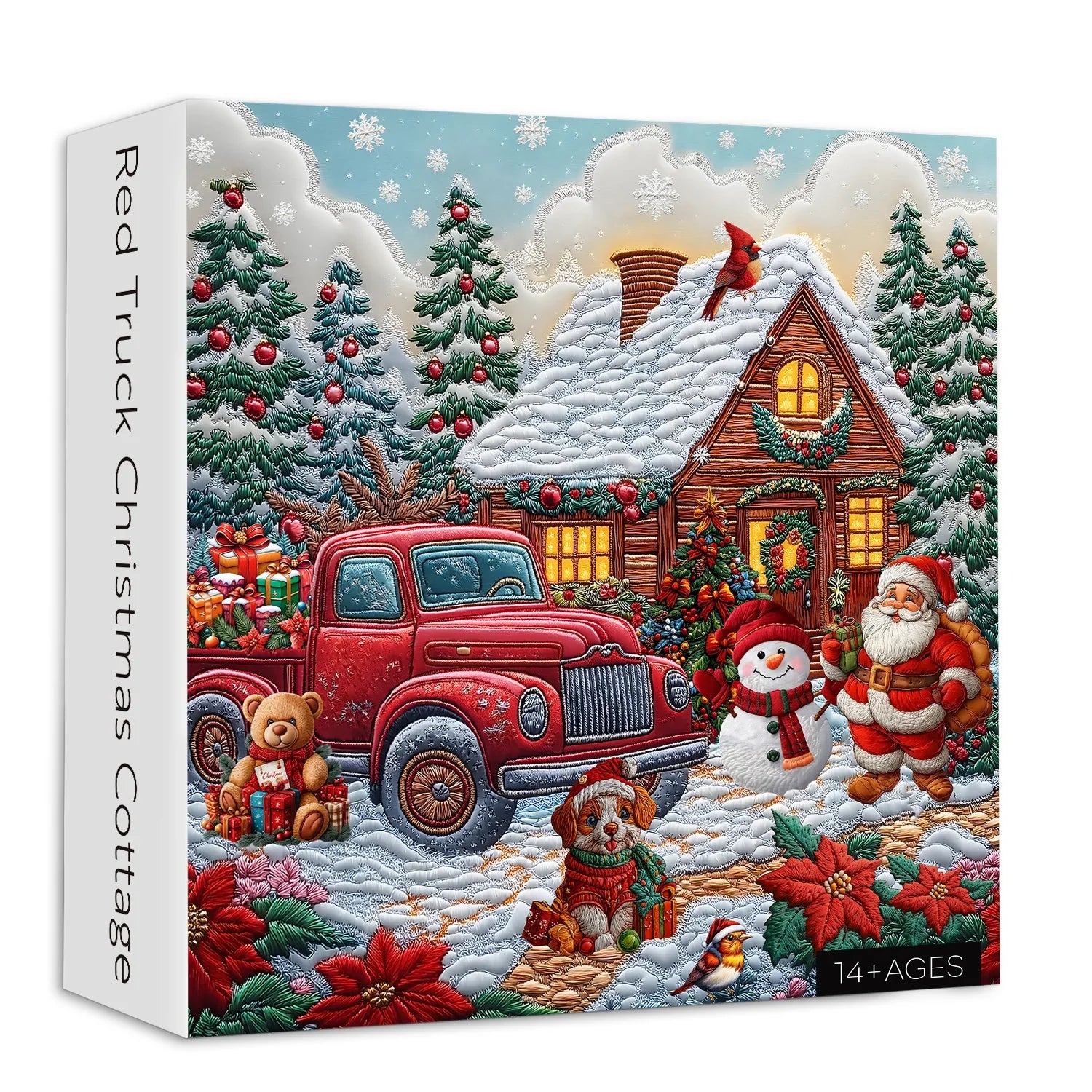 🎅Red Truck Christmas Cottage Jigsaw Puzzle:Dieses Puzzle zeigt eine herzerwärmende Weihnachtsszene, während der Weihnachtsmann in eine mit Lichtern und Girlanden geschmückte Kabine geht und bereit ist, den Urlaubsjubel zu verbreiten. Ein mit Geschenken beladener Oldtimer -Rot -Auto fährt vor der Kabine hoch und stapelt sich mit farbenfrohen Kisten und ergänzt die festliche Atmosphäre. Ein fröhlicher Welpe und ein loyaler Rentier begleiten den Weihnachtsmann und verleihen dieser festlichen Geschichte Wärme und Energie.