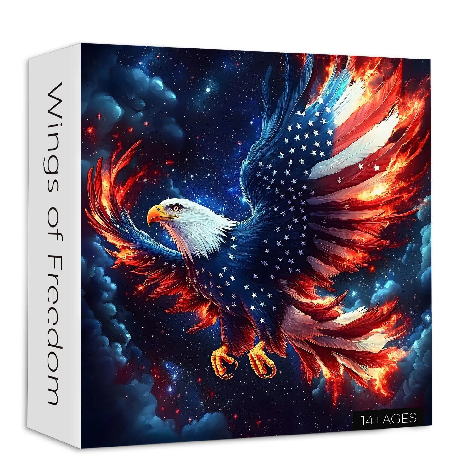 Eagle with American Flag Wings  This 1000-piece puzzle features an eagle soaring through space, with its wings painted in the American flag. The vibrant red, white, and blue colors, along with fiery wings and stars, symbolize freedom and strength.