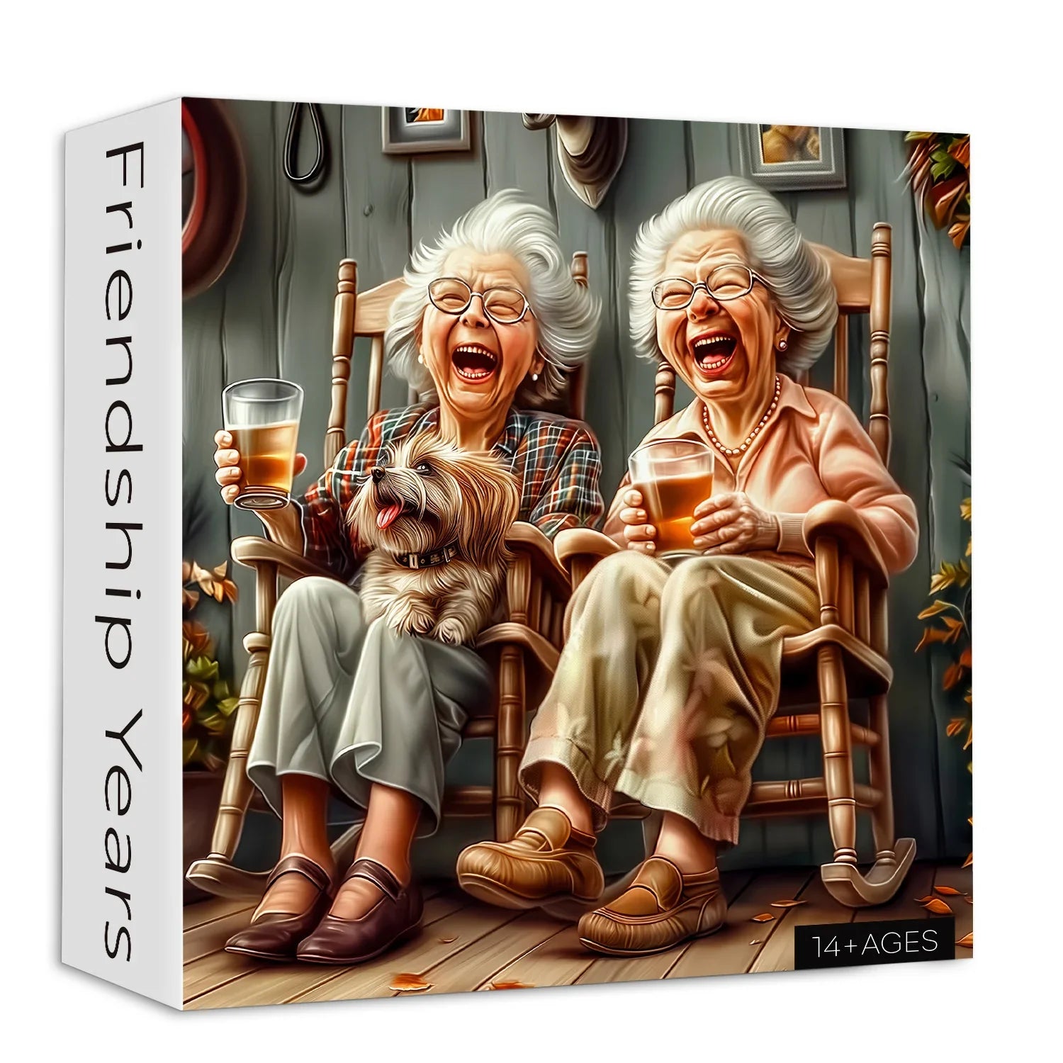 👵【Friendship Years】This puzzle shows two silver-haired grandmas enjoying a happy time in a rocking chair, their smiles are warm and sincere, conveying a strong friendship and the joy of life. The grandmas are dressed in casual clothes, wearing comfortable shoes, holding a cute puppy in their arms, and holding a drink cup in their hands. From the kind faces of the grandmothers to the lively expressions of the puppies, to every small object in the background, it is full of the breath of life and the beauty of art.🧩💖