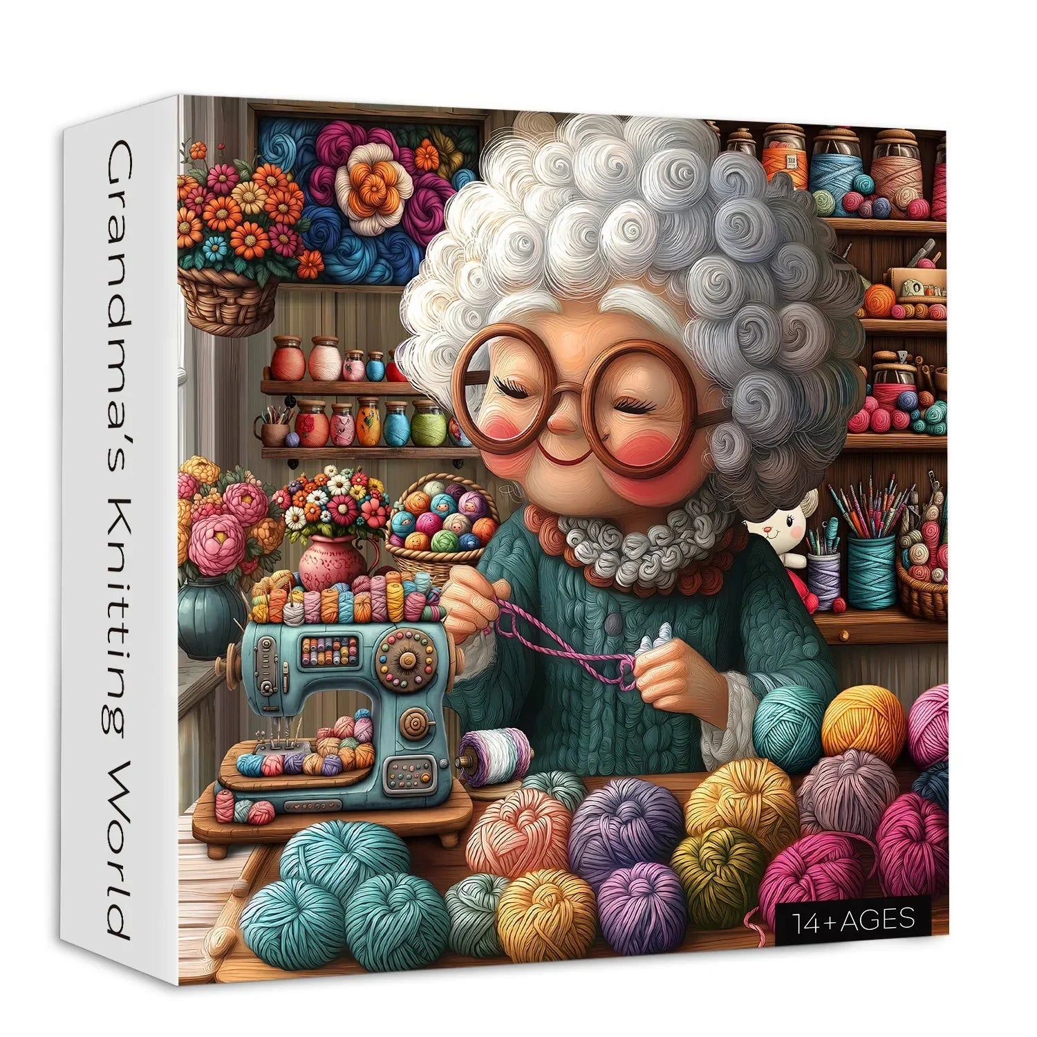 Warm and handmade theme:This puzzle shows a cute old lady with curly hair and glasses, quietly knitting in her craft room. The picture is rich in details, surrounded by colorful wool balls, sewing machines, embroidery tools, etc., creating a warm and friendly atmosphere.