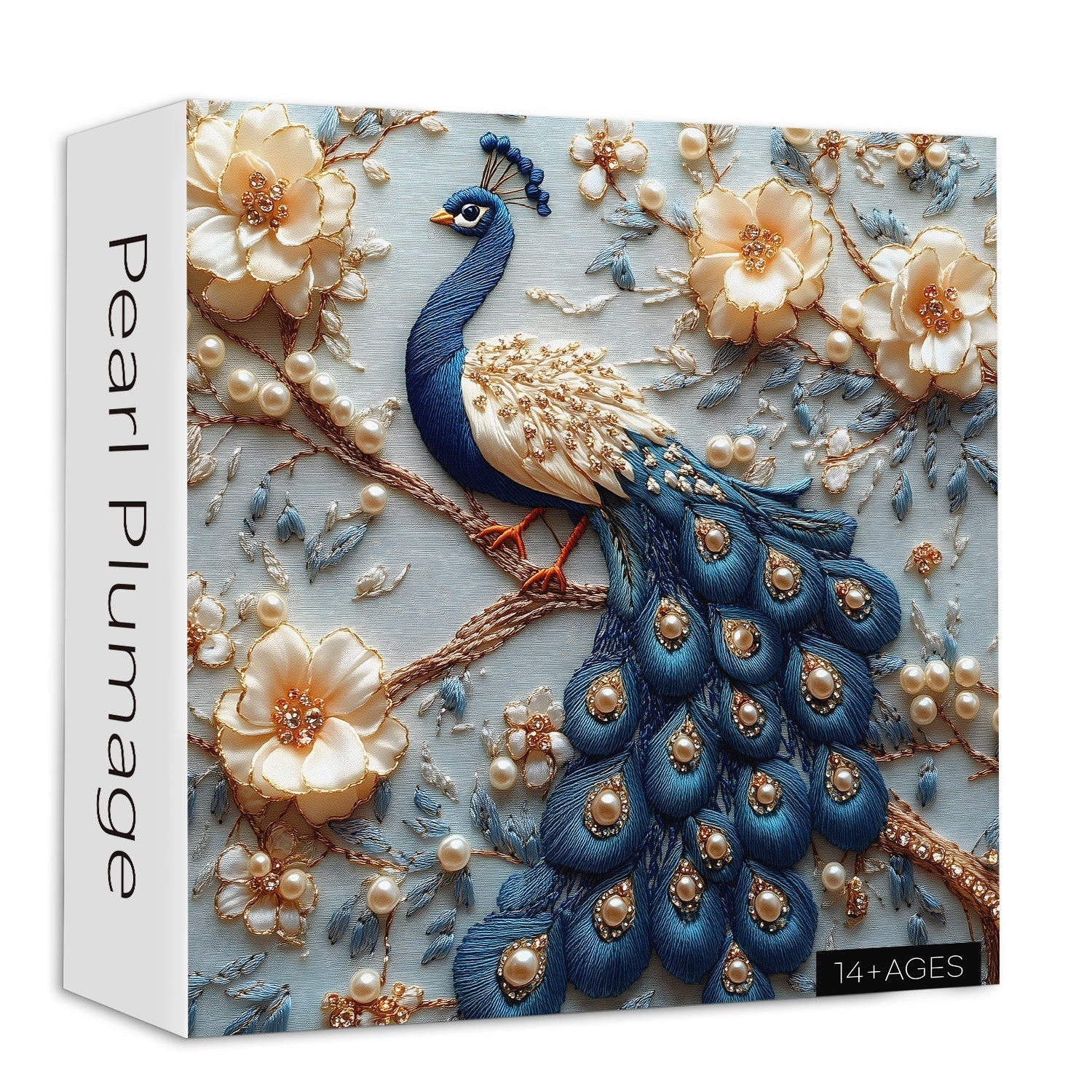 Composition: The peacock is positioned amidst cream-colored flowers and delicate branches, with scattered pearls enhancing the ornate, elegant arrangement.