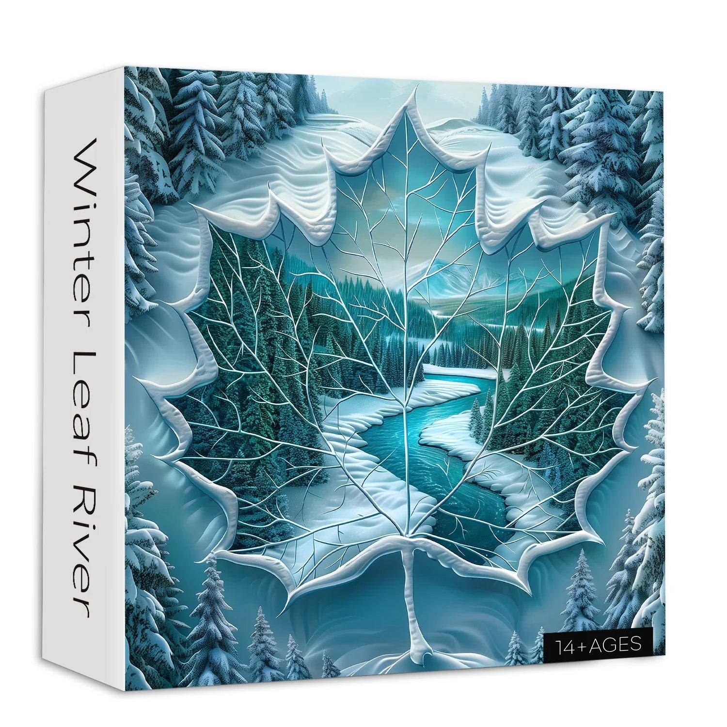Winter Landscape: Inside the leaf frame, there is a snowy winter landscape with a winding turquoise river cutting through a dense forest of evergreen trees covered in snow.