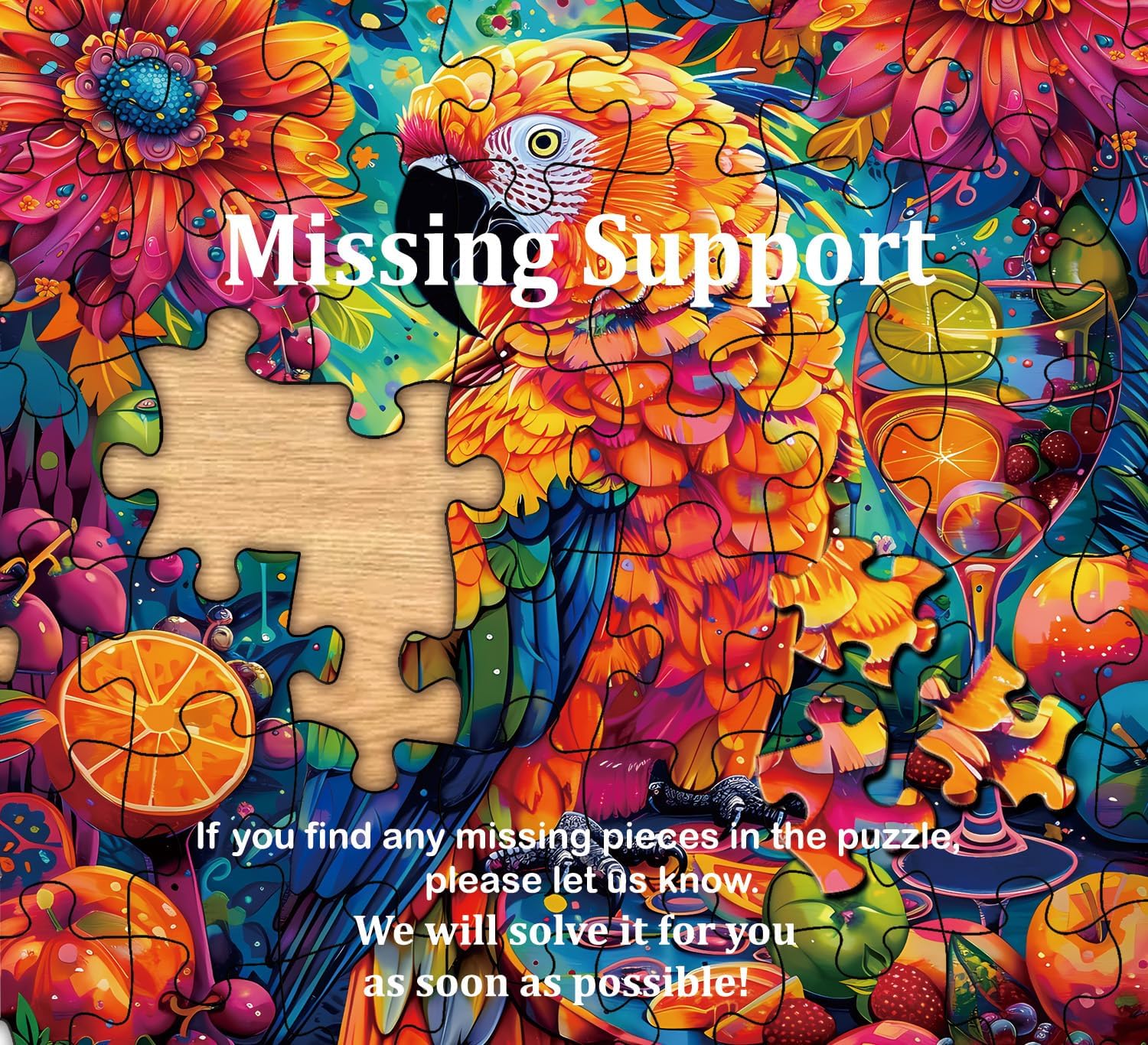 Colorful puzzles: flower puzzles 1000 pieces shows a colorful parrot, perched in a tropical jungle. Surrounded by bright flowers and tempting tropical fruits, it creates a rich tropical atmosphere.