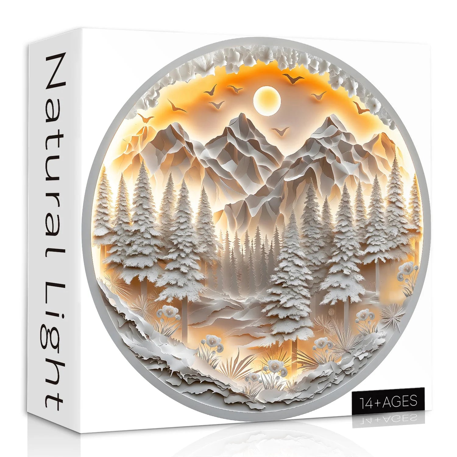 Diseño cautivador con intrincado arte de corte en papel Este rompecabezas de 1000 piezas presenta un impresionante marco circular adornado con diseños detallados de reducción de papel. El impresionante fondo muestra montañas nevadas, bosques densos y un sol brillante que se eleva sobre el horizonte.