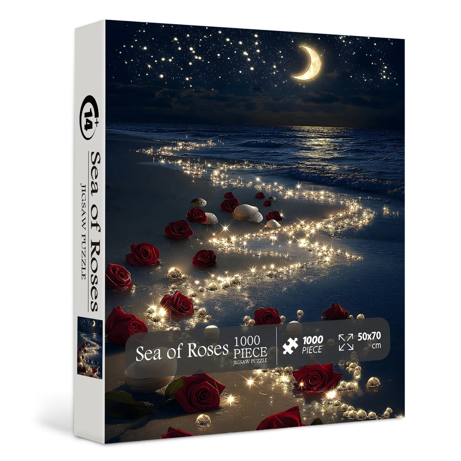 Diseño romántico soñador: Sumérgete en una fascinante escena de la playa por la noche, donde las rosas rojas, las conchas blancas y las perlas brillantes crean un ambiente impresionante. Las estrellas brillantes, la luna creciente y las criaturas brillantes que flotan en el aire ofrecen un mundo mágico de cuento de hadas, perfecto para momentos románticos.