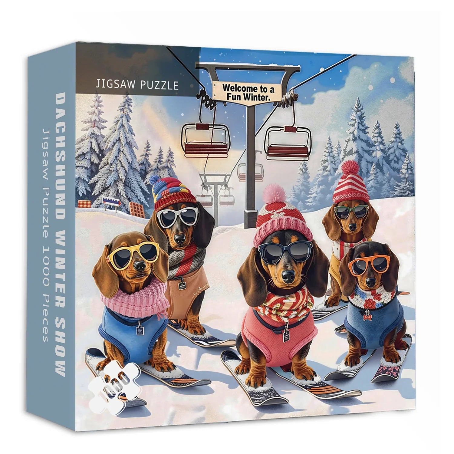 ❄️🐶【Puzzle du spectacle d'hiver de teckel】 : 🏔️ Des flocons de neige tourbillonnent dans l'air, un téléphérique monte lentement et une vallée hivernale est une scène de joie. Cinq teckels incroyablement élégants sont habillés de pulls et de lunettes de soleil. Ce puzzle capture à la fois la gentillesse, les moments réconfortants et la joie des vacances d'hiver ; on entend presque les chiots rire dans la neige.