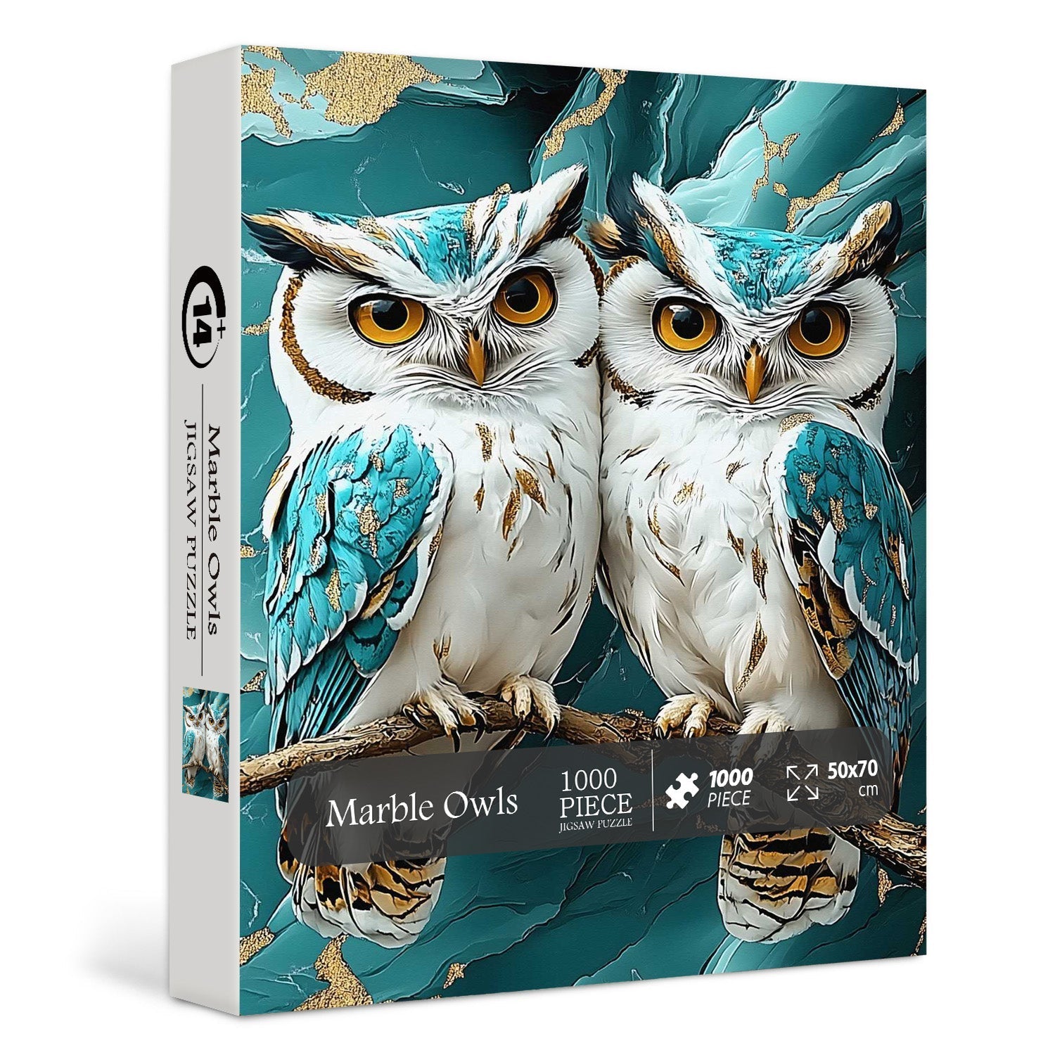 Perched in silent wisdom upon a graceful branch, a pair of elegant white owls command attention. Adorned with exquisite turquoise and gold accents, they are set against a breathtaking backdrop of marbled teal and gold—a swirling, luxurious canvas that evokes the depth of precious stone and the whisper of ancient secrets. This puzzle is a striking fusion of natural elegance and opulent artistry, designed to captivate and inspire with its mystical, serene beauty.
