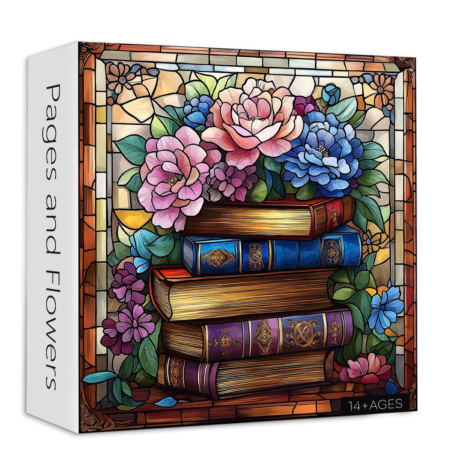 【Pages and Flowers Puzzle This puzzle is set against a stained glass window with several ancient and mysterious books stacked in it, surrounded by colorful flowers. The rich colors of the book covers complement the bright tones of the flowers, from deep blue to passionate red, making each puzzle piece vivid and energetic.