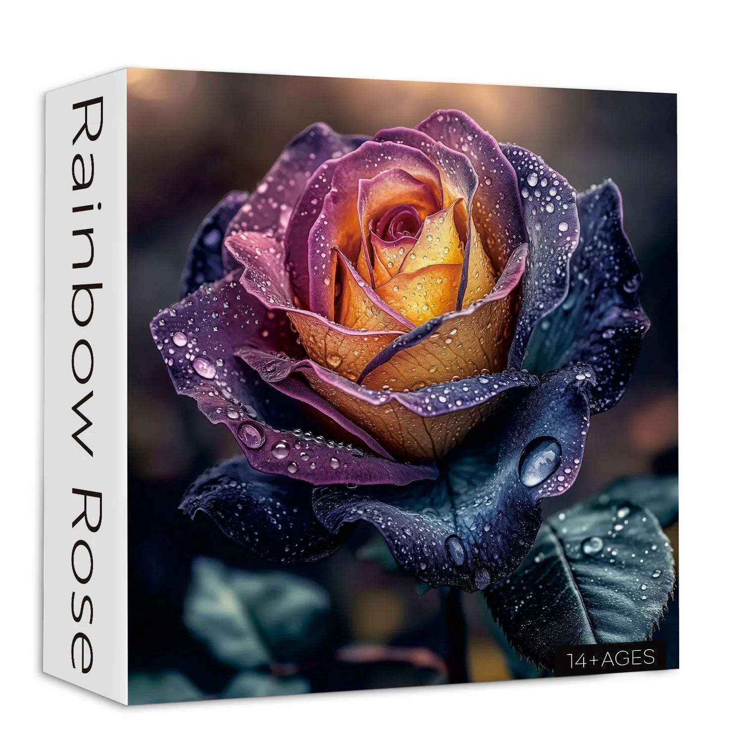 Stunning and Realistic Design Featuring a breathtaking rainbow-colored rose, with vibrant purple and yellow petals, and dew-kissed leaves, this 1000-piece puzzle brings nature’s beauty to life with incredible realism.